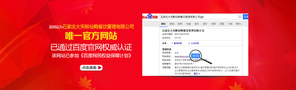 隨著產品的升級,大宋醉仙鴨總部的經(jīng)營理念不斷提升,經(jīng)營的規(guī)模不斷擴大,之后又陸續(xù)開了多家直營店。2014年3月,石家莊大宋醉仙鴨餐飲管理有限公司正式成立,之后在國家商標總局申請注冊“大宋醉仙鴨”商標。